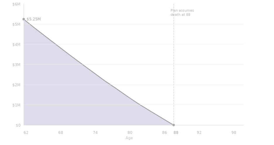 The full distribution of outcomes from $5.25M at age 62. WealthSpan ends when your band hits zero.