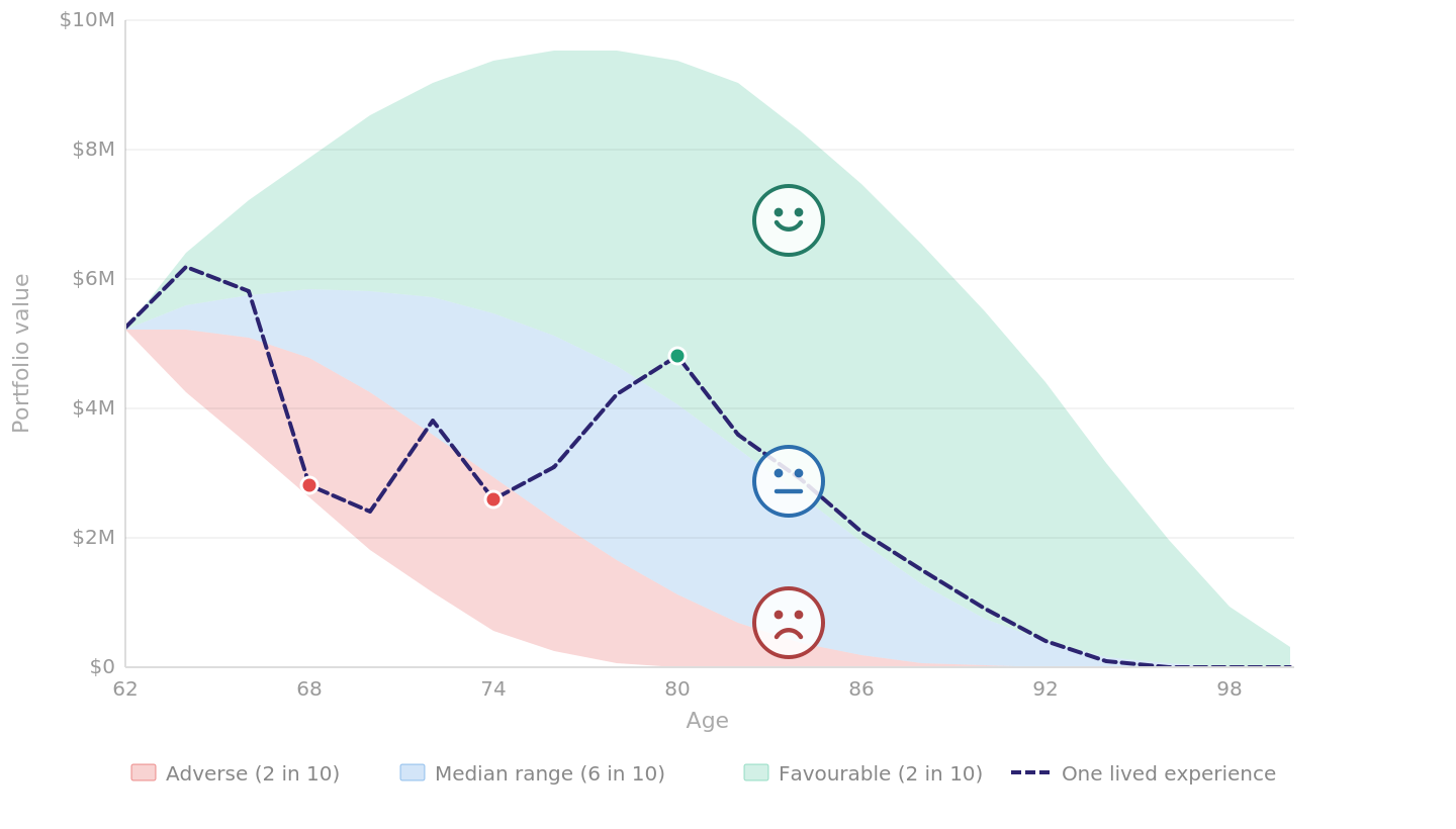 The green band at the top is the favourable two in ten. Markets cooperate, health costs stay modest, an inheritance arrives or a property settles well – capital accumulates or holds its ground longer than expected – coupled with smart decisions.
